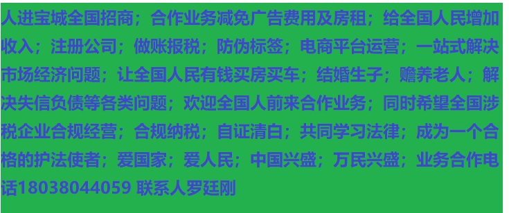 人進(jìn)寶城全國招商;合作業(yè)務(wù)減免廣告費(fèi)用;歡迎全國涉稅企業(yè)前來合作;業(yè)務(wù)合作電話 18038044059 聯(lián)系人羅廷剛